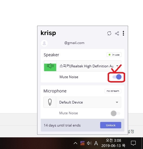 Krisp를 처음 설치하면 14일동안은 Microphone 기능을 무료사용하게 해 준다.