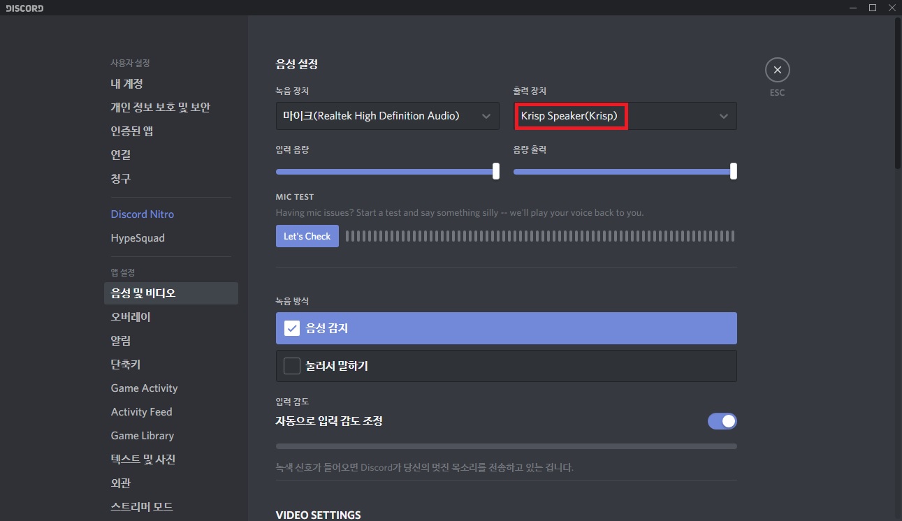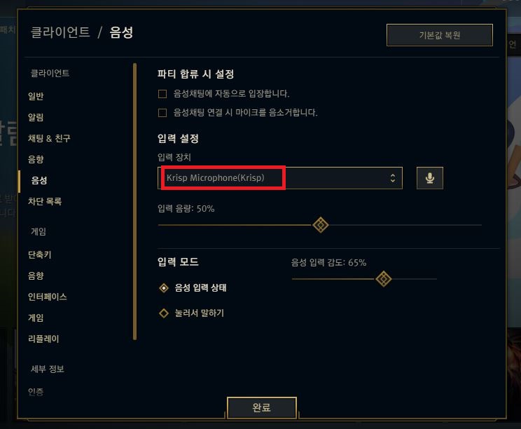 리그 오브 레전드의 음성 채팅은... 마이크밖에 선택할 수가 없다. 게임 사운드 전체를 Krisp 스피커로 듣게 설정할 순 있지만, 그렇게 하면 게임 소리들이 어떻게 될지.